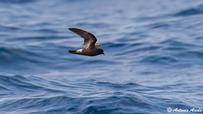 Seguidamente, mientras estábamos al chum, Antonio Acedo alerta de un nutrido grupo de pardelas cenicientas por proa. Más de medio centenar evolucionan en vuelo para sedimentarse en una balsa cercana a la que nos fuimos aproximando pausadamente para disfrutar de ellas. Mientras por popa Pablo Galiano pudo observar un segundo paíño europeo.